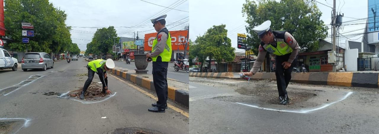 Pihak Kepolisian menyemprotkan cat di sekeliling jalan berlubang dan bergelombang sebagai penanda bagi pengguna jalan.