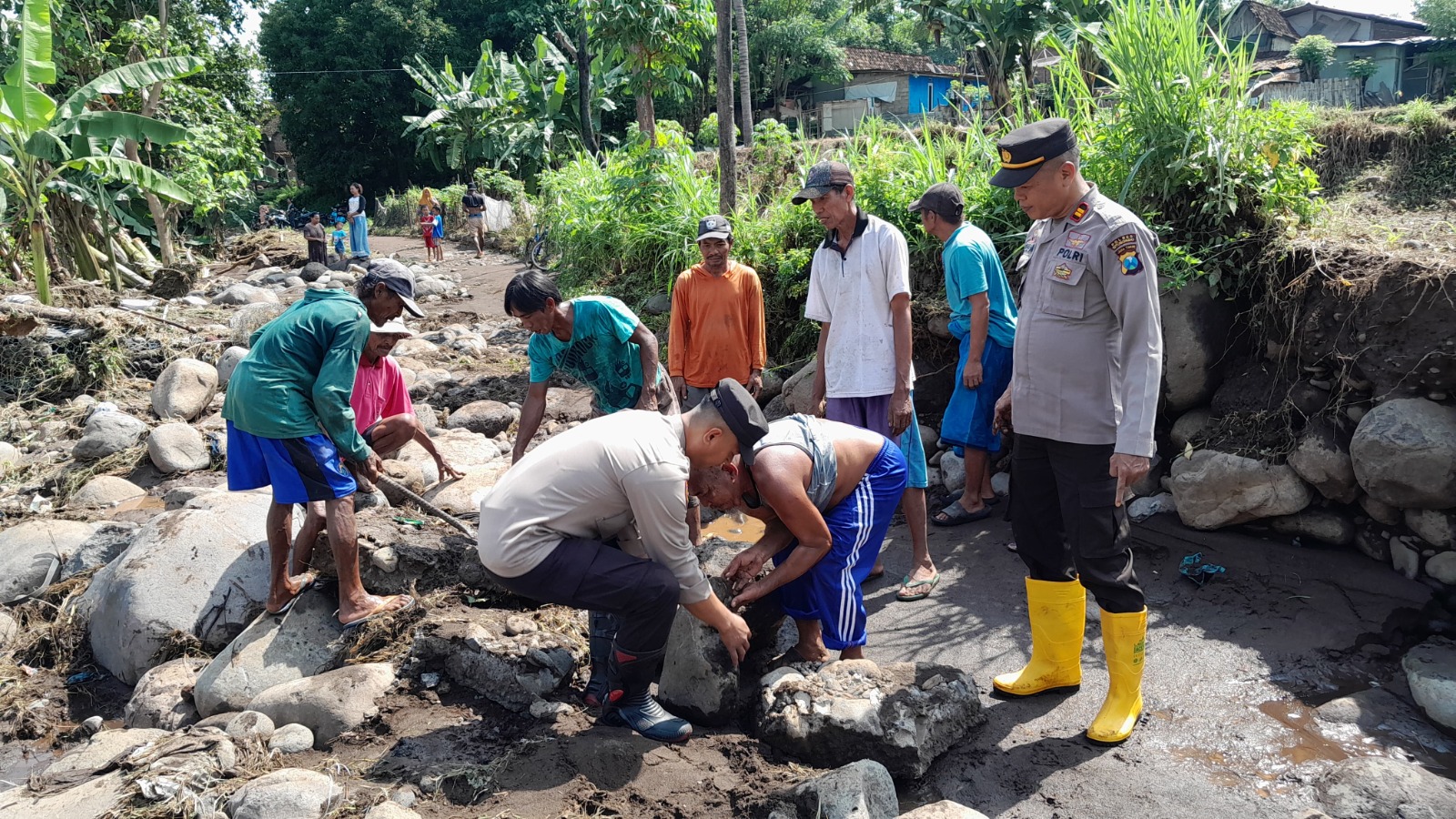 SITUBONDO, PortalNusantaraNews.co.id Personel Polsek Jatibanteng Polres Situbondo bersama masyarakat melaksanakan kerja bakti membersihkan kayu dan material sisa banjir serta memasang bronjong di Jembatan Dusun Dauh Desa Jatibanteng.Baca Juga: Di SPPG Polres Madiun Ada Menu Nasi Pecel Bergizi untuk Pelajar di Sekolah