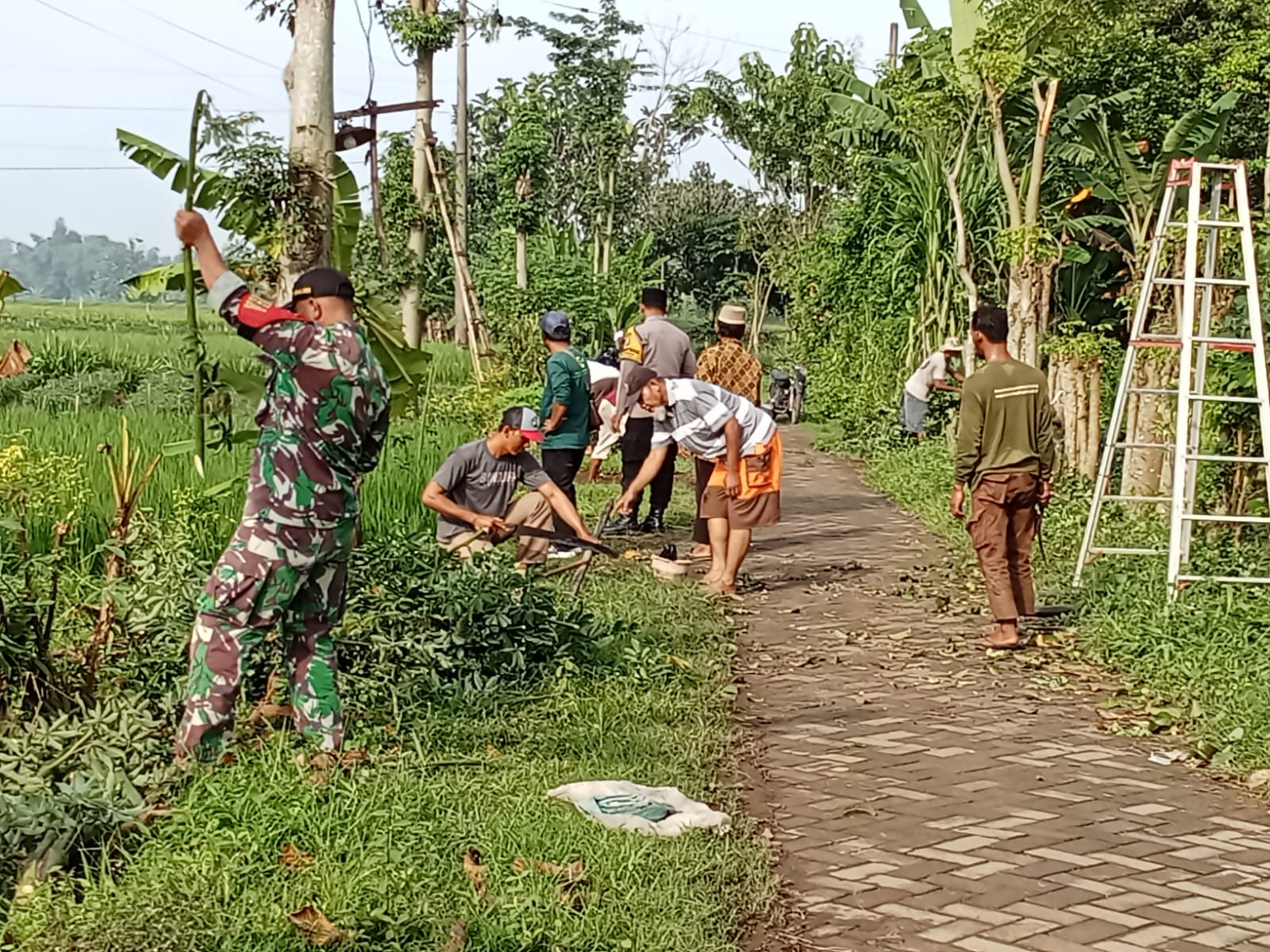 Bhabinkamtibmas Desa Begendeng Polsek Jatikalen Polres Nganjuk Aiptu Wahyu dengan Babinsa Desa Begendeng Serka Saiful Naim melaksanakan kerja bakti bersama warga membersihkan jalan kampung serta membersihkan gorong gorong atau saluran air di wilayah setempat.