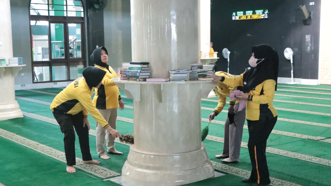 Sejumlah personel kepolisian dikerahkan untuk membersihkan bagian dalam dan luar masjid, termasuk menyapu, mengepel, mencuci karpet, serta merapikan fasilitas ibadah.