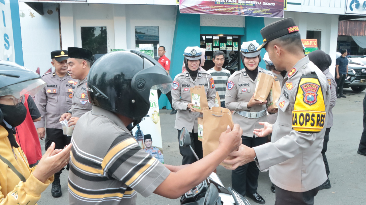 NGANJUK, PortalNusantaraNews.co.id Menjelang waktu berbuka puasa, Polres Nganjuk menggelar aksi sosial dengan membagikan ratusan paket takjil kepada pengguna jalan di Pos 90 Pujahito Satlantas Polres Nganjuk, Senin (10/3/2025).