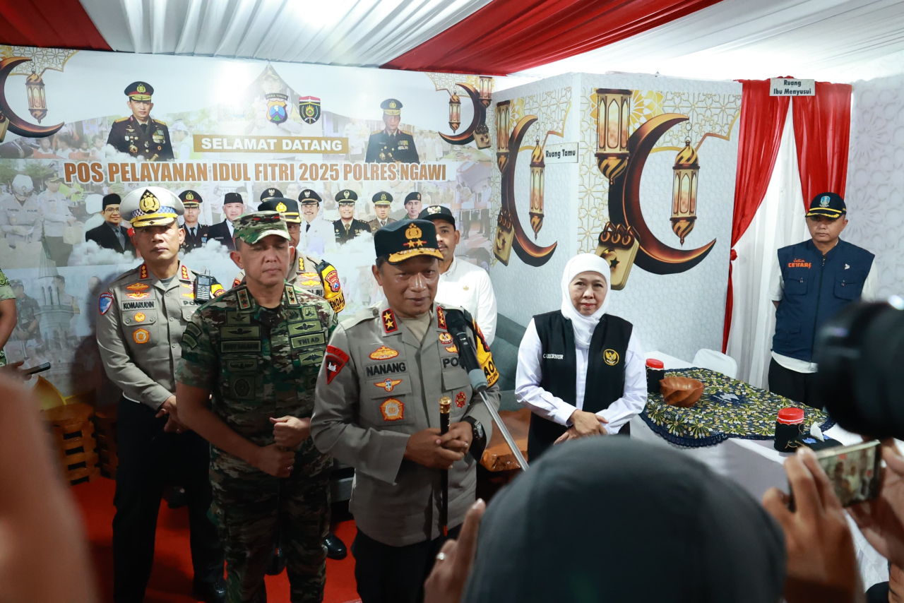NGAWI, PortalNusantaraNews.co.id Kapolda Jawa Timur Irjen Pol Nanang Avianto, bersama Gubernur Jawa Timur Khofifah Indar Parawansa, dan Pangdam V/Brawijaya Mayjen TNI Rudy Saladin, melakukan pengecekan di Pos Pelayanan Rest Area 575 A Ngawi, pada Jumat (28/3/2025).