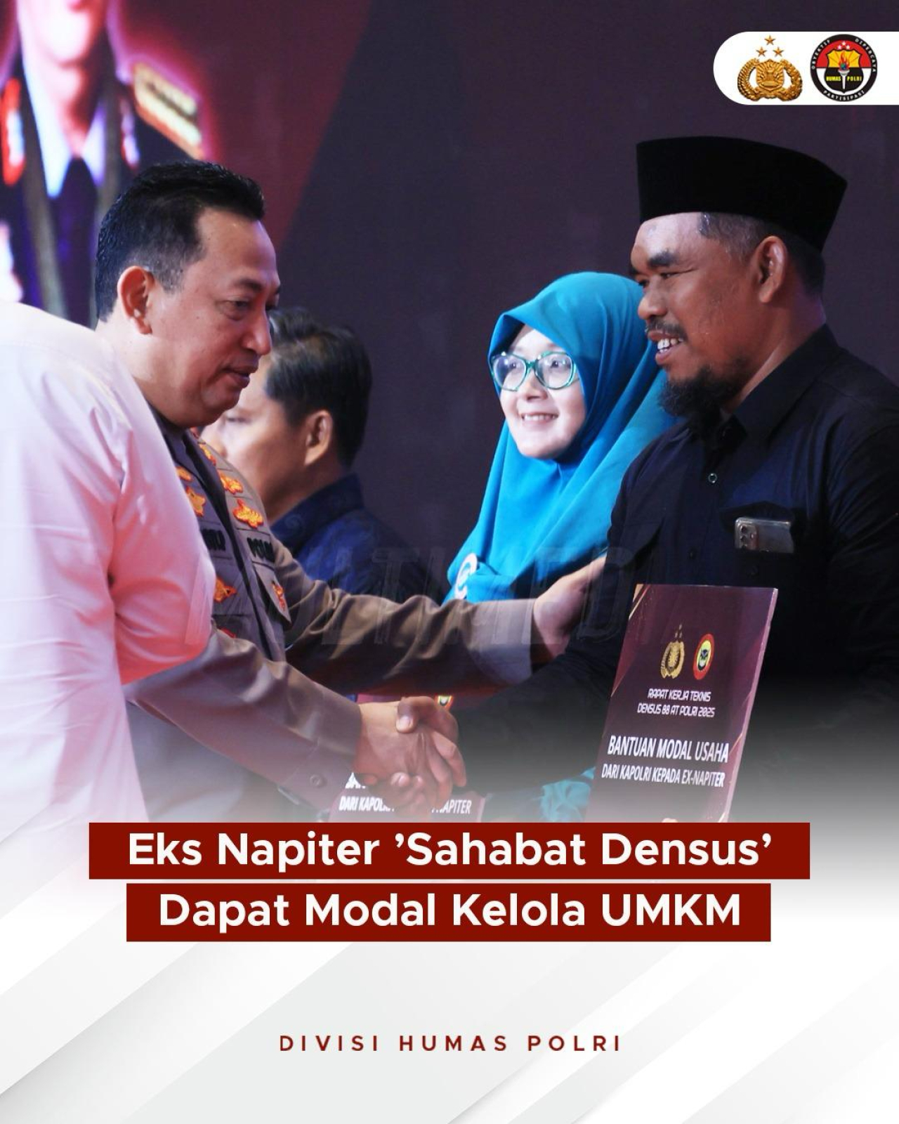 JAKARTA, PortalNusantaraNews.co.id Eks napiter ‘Sahabat Densus’ dapat modal kelola UMKM. Densus 88 Antiteror Polri menggandeng para eks narapidana terorisme (napiter) untuk mengembangkan Usaha Mikro, Kecil, dan Menengah (UMKM). Pada Rakernis Densus 88 Antiteror Polri di Auditorium PTIK-STIK Lemdiklat Polri, Jakarta, pada Selasa (22/4), Polri juga memberikan bantuan modal UMKM di masing-masing daerah eks napiter atau Sahabat Densus. Kegiatan ini menjadi bentuk nyata upaya Polri, khususnya Densus 88, dalam mendukung reintegrasi sosial dan kemandirian ekonomi bagi para eks napiter, sebagai bagian dari strategi komprehensif menjaga keamanan nasional secara berkelanjutan.
