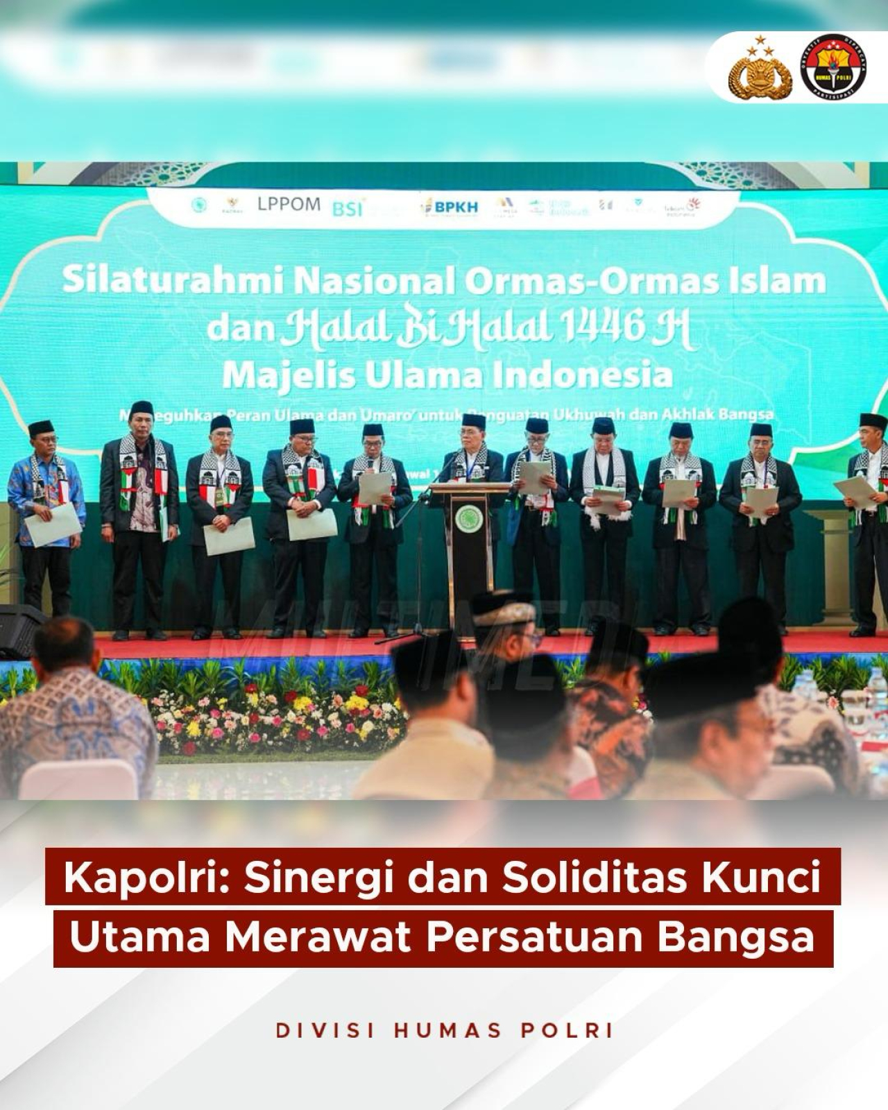 JAKARTA TIMUR, PortalNusantaraNews.co.id Kapolri: Sinergi dan soliditas kunci utama merawat persatuan bangsa. Kapolri Jenderal Polisi Drs. Listyo Sigit Prabowo, M.Si., menghadiri kegiatan silaturahmi nasional ormas-ormas Islam dan Halal Bihalal Idul Fitri 1446 Hijriah Majelis Ulama Indonesia (MUI) di Gedung Serbaguna 1 Asrama Haji, Jakarta Timur, Kamis (24/4). Kapolri menuturkan bahwa kegiatan ini merupakan bentuk komitmen dari Polri untuk memperkuat serta berperan aktif dalam merawat nilai persaudaraan atau ukhuwah bangsa Indonesia. Lebih lanjut, sinergisitas ulama dan elemen masyarakat dianggap sebagai kunci utama untuk membawa Indonesia ke arah lebih baik ke depannya. "Terjalinnya sinergisitas ulama dan umara serta elemen masyarakat lainnya merupakan hal penting. Tentunya ini merupakan kunci guna menghadapi segala macam bentuk tantangan zaman," tutur Kapolri.