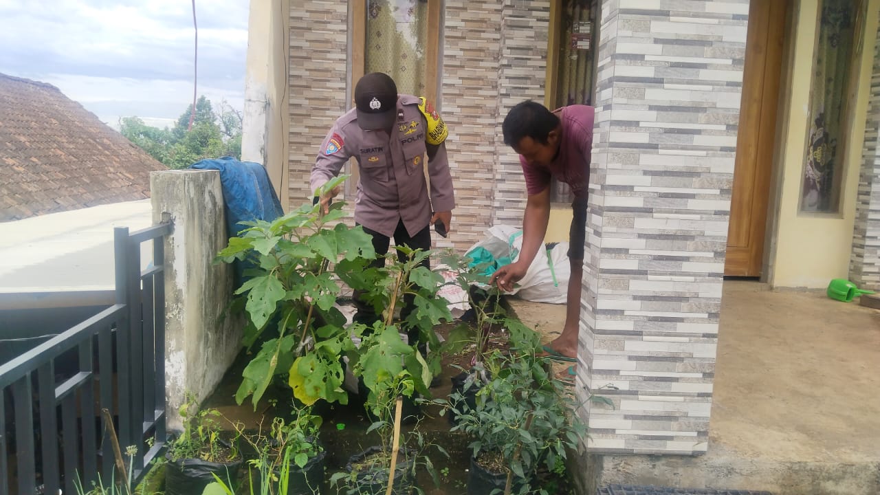 Dalam kegiatan tersebut, Aipda Suratin mengecek langsung kondisi tanaman cabai milik Bapak Yarno dan memberikan arahan ringan seputar perawatan serta pengendalian hama tanaman.
