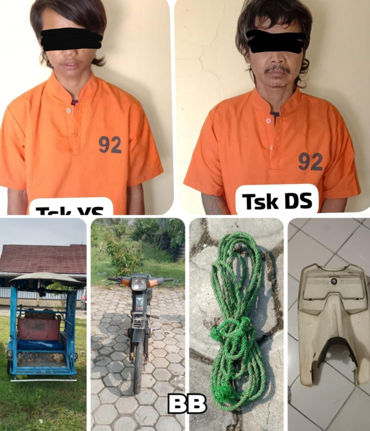 Dari tangan pelaku, polisi menyita sejumlah barang bukti termasuk sepeda motor curian, tali plastik, dan kendaraan bentor yang digunakan untuk menarik hasil curian.