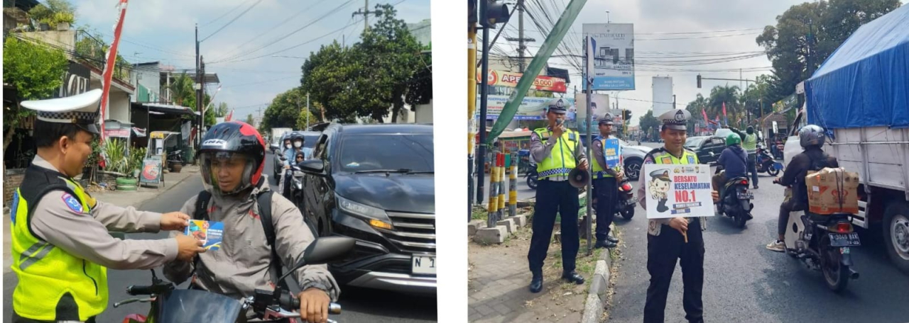 Kegiatan berlangsung secara simpatik, di mana pengendara yang melintas disambut dengan senyum oleh petugas sambil diberikan brosur keselamatan dan ajakan untuk tertib berlalu lintas.