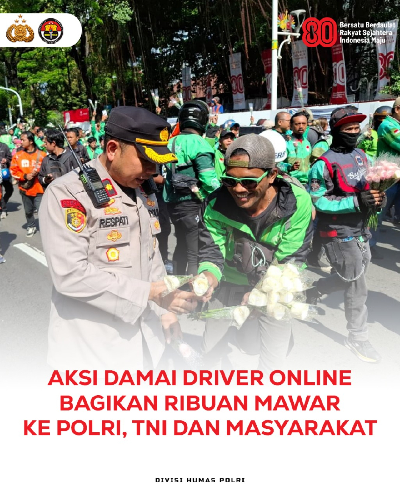 Polri mengapresiasi ribuan bunga mawar yang dibagikan oleh ratusan pengemudi ojek online sebagai simbol cinta kasih dan perdamaian di kawasan Monas, Jakarta Pusat, Selasa (2/9). Para pengemudi ojol membagikan 2.000 tangkai bunga dan bersalaman dengan aparat TNI-Polri yang berjaga di sepanjang rute aksi. Suasana penuh kehangatan tercipta saat masyarakat dan aparat menerima mawar sebagai tanda persaudaraan. Terima kasih kepada sahabat ojol yang telah menunjukkan bahwa perdamaian selalu lebih indah daripada perpecahan.