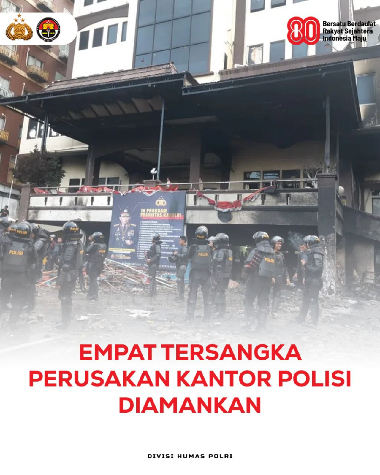Polri melalui Polres Metro Jakarta Timur, Polda Metro Jaya mengamankan empat tersangka perusakan kantor polisi saat aksi demo ricuh pekan lalu. Hingga saat ini, polisi masih mendalami peran mereka dan memburu kelompok lain yang terlibat. "Polsek Jatinegara dua orang, Polsek Cipayung satu orang, Polres Metro Jaktim satu orang," kata Kasat Reskrim Polres Metro Jakarta Timur AKBP Dicky Fertoffan Bachriel, S.H., S.I.K., dalam keterangannya pada Jumat (5/9).
