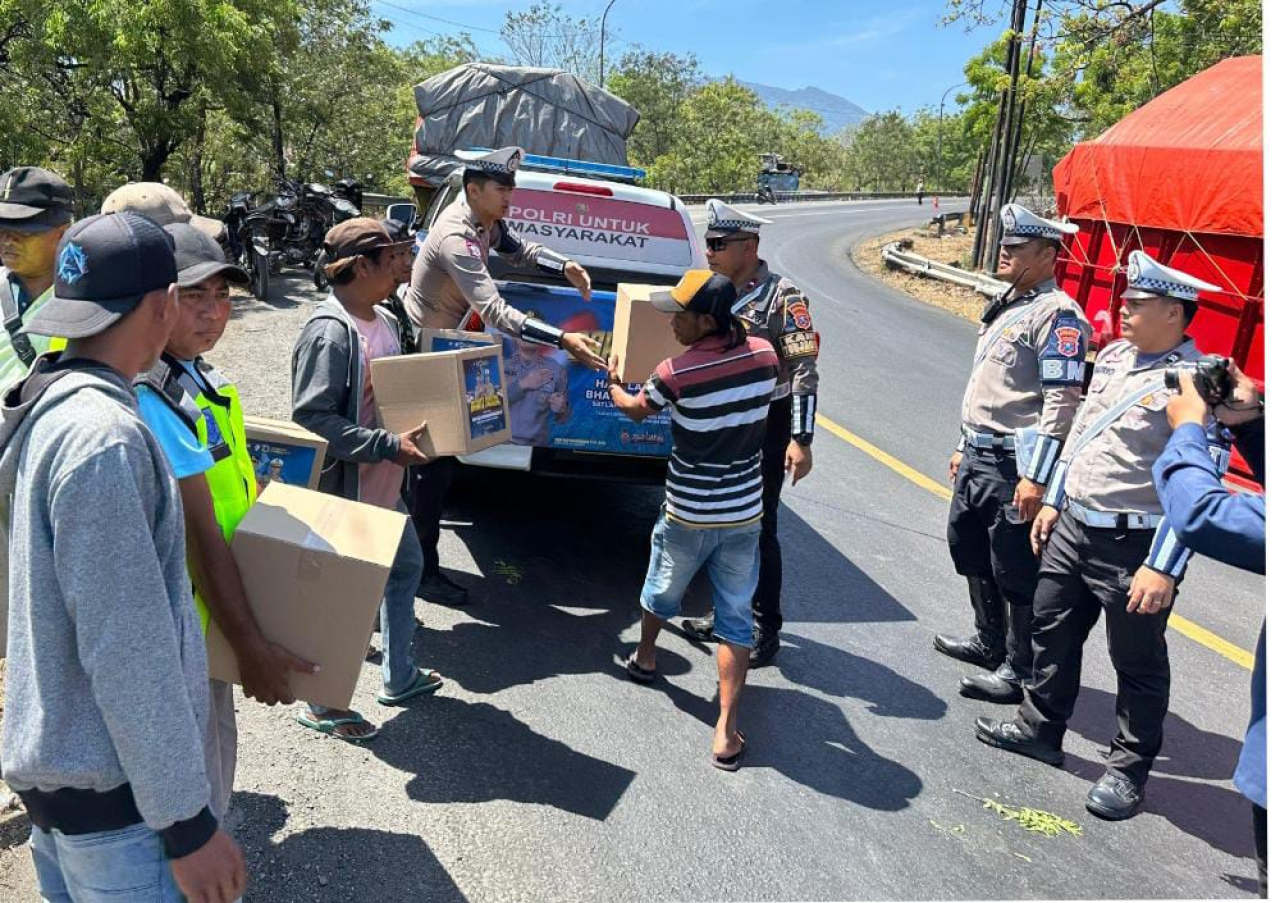 Selain berbagi sembako, Satlantas Polres Situbondo Polda Jatim juga menyampaikan imbauan tertib berlalu lintas dan pentingnya mematuhi aturan demi keselamatan bersama.