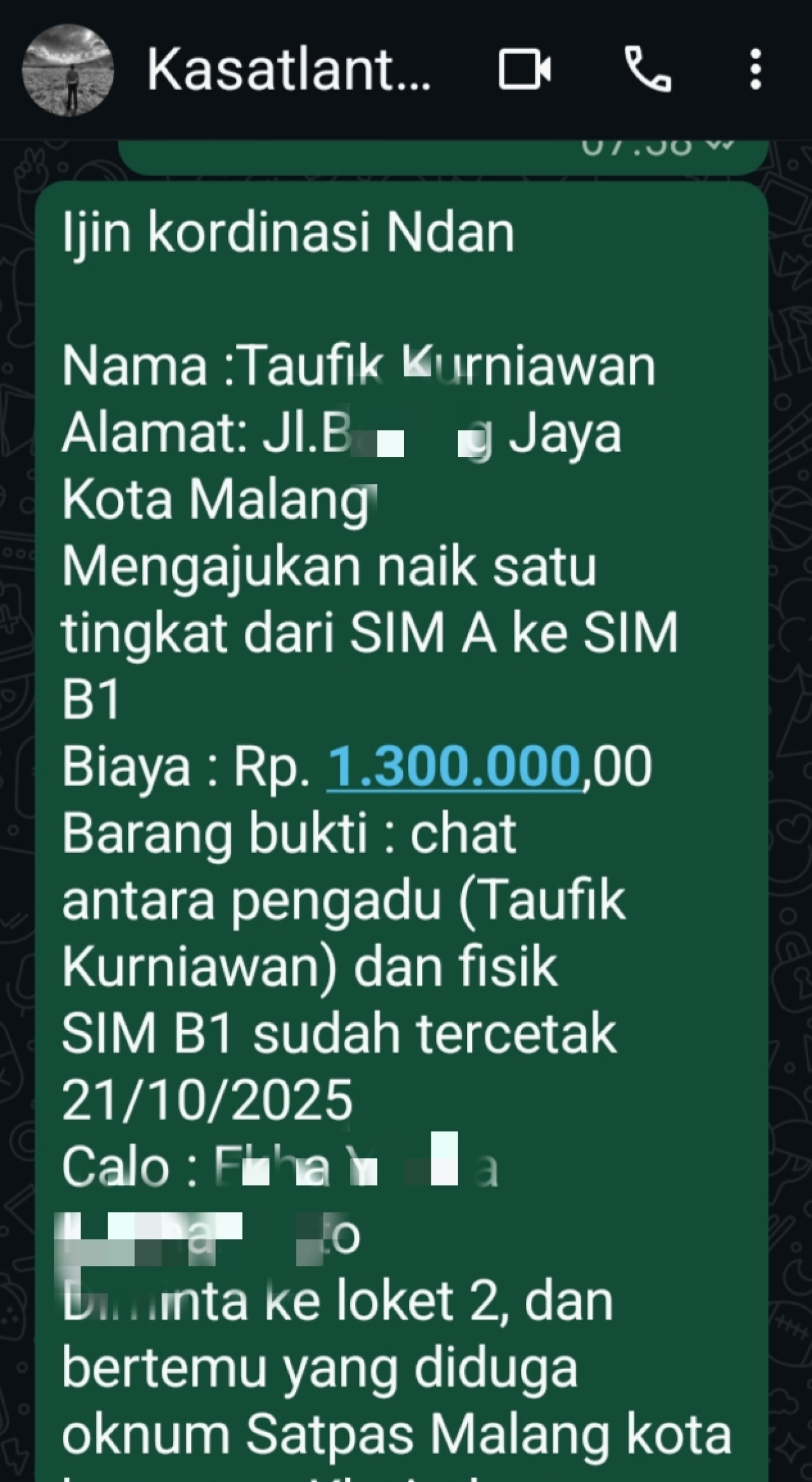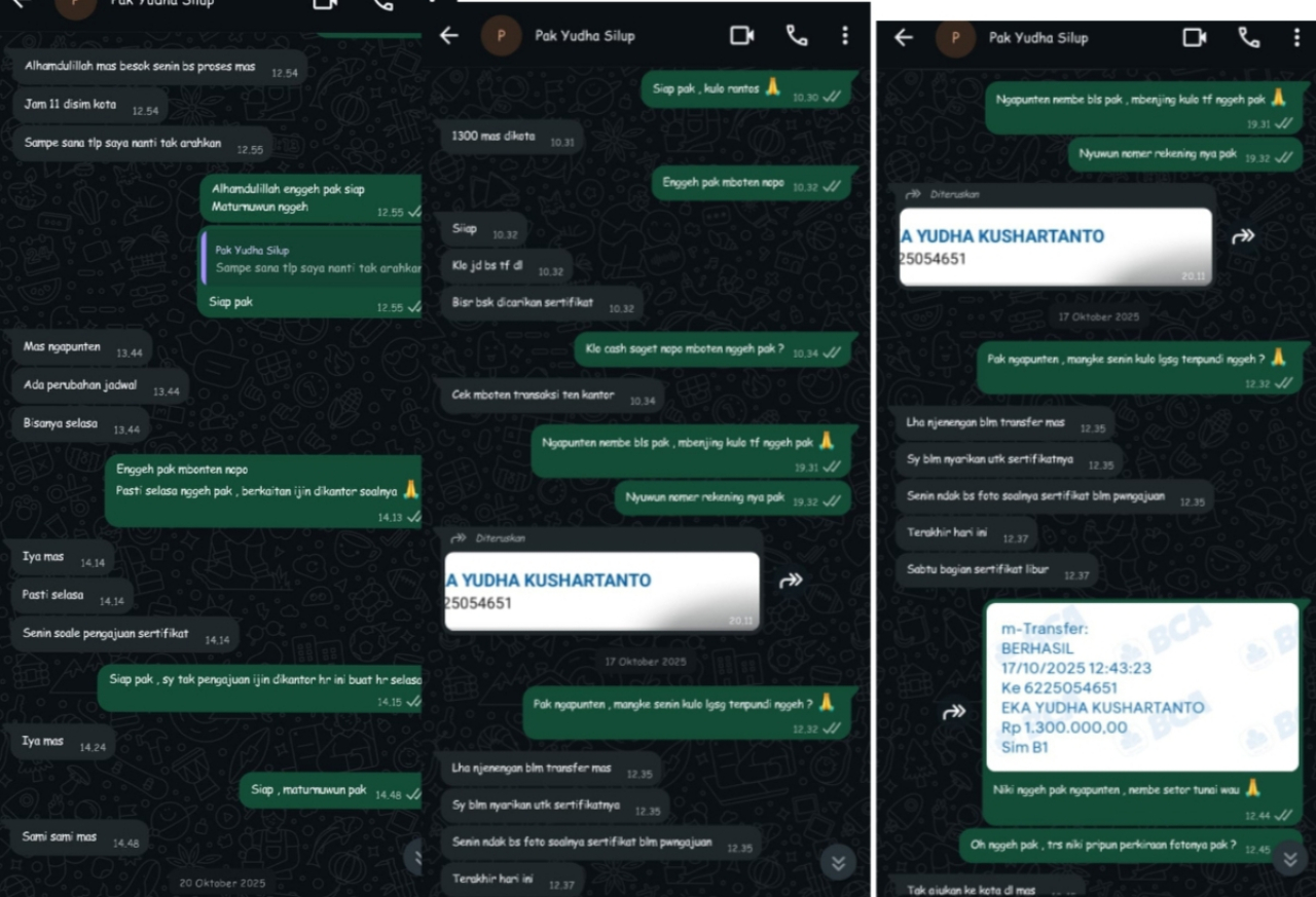Setelah transfer dilakukan, inisial TK diinstruksikan menemui oknum berinisial AL di Loket 2 Satpas Malang Kota.
