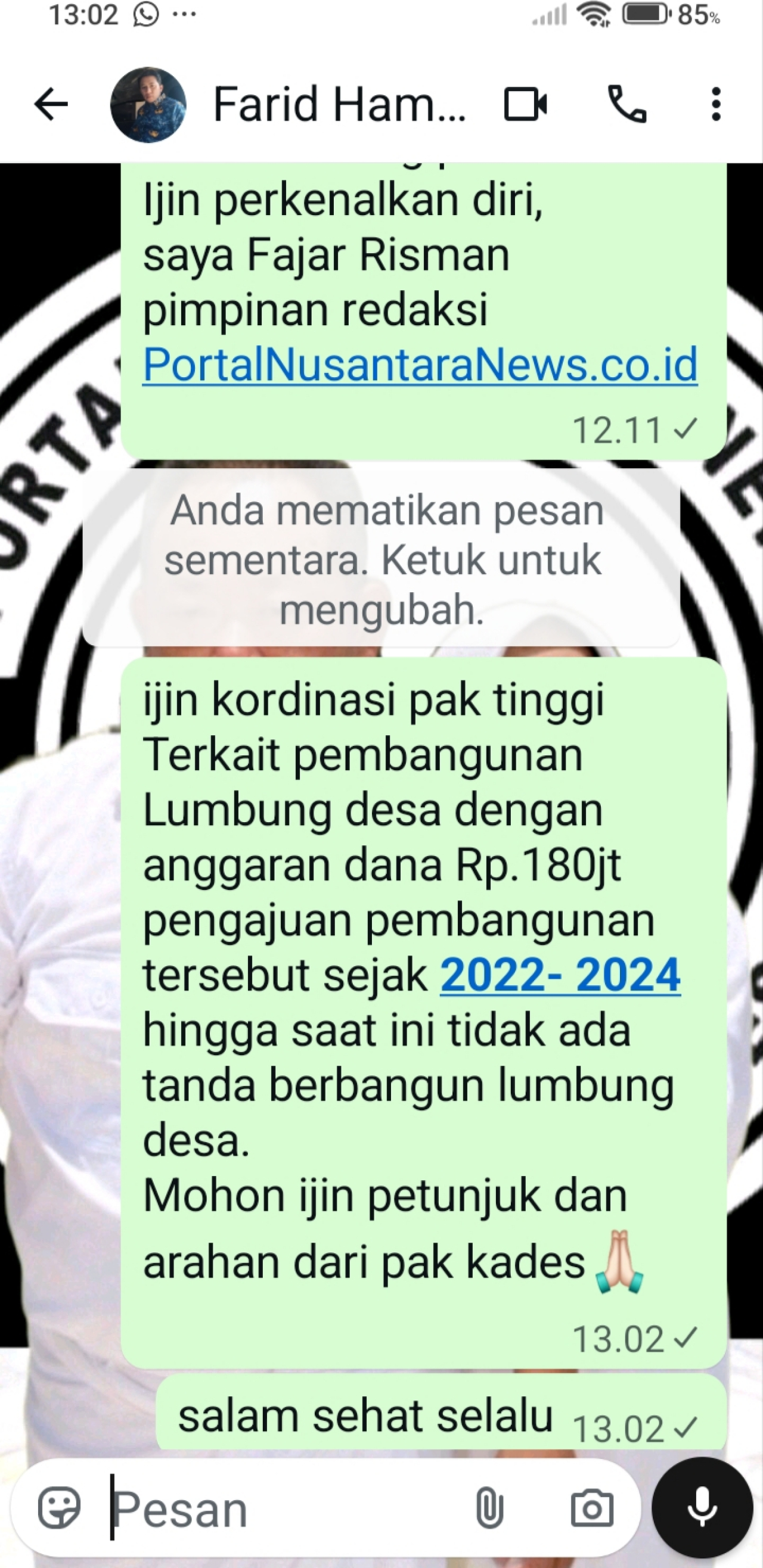Sebelum melanjutkan investigasi awakmedia berkordinasi dengan FHN melalui aplikasi WhatsApp namun tidak ada respon saat awakmedia klarifikasi, Senin, 28/04/2026.