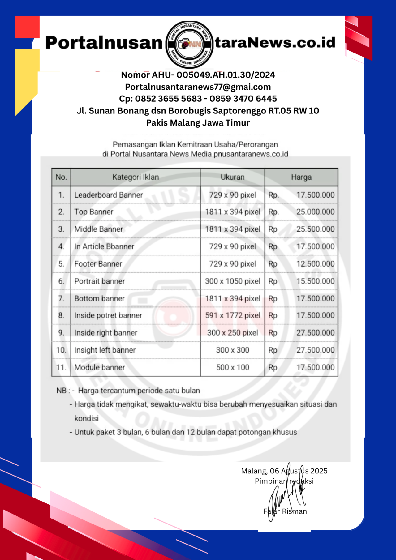 Alamat Perusahaan/Redaksi: Jl.Sunan Bonang dusun Borobugis RT 05 RW 10 Saptorenggo Pakis kabupaten Malang Jawa Timur 65154